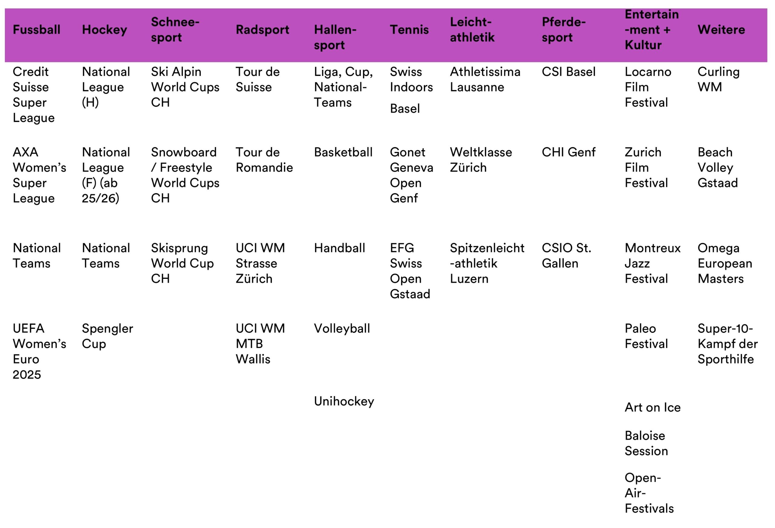 - Kontinuierliche Analyse von mehr als 330 Sportanlässen sowie 28 Entertainment-Events